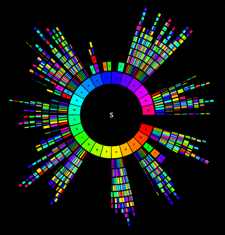 In the fall of my sophomore year at Princeton, I took an introduction to linguistics class where we talked in great detail about the sounds of the english language and how they interact with each other. This, combined with my computer science class where we were implementing tree structures, inspired me to make this visualization of the english lexicon by organizing words by their sequence of letters in order to shed light on their relationships in an intuitive way.